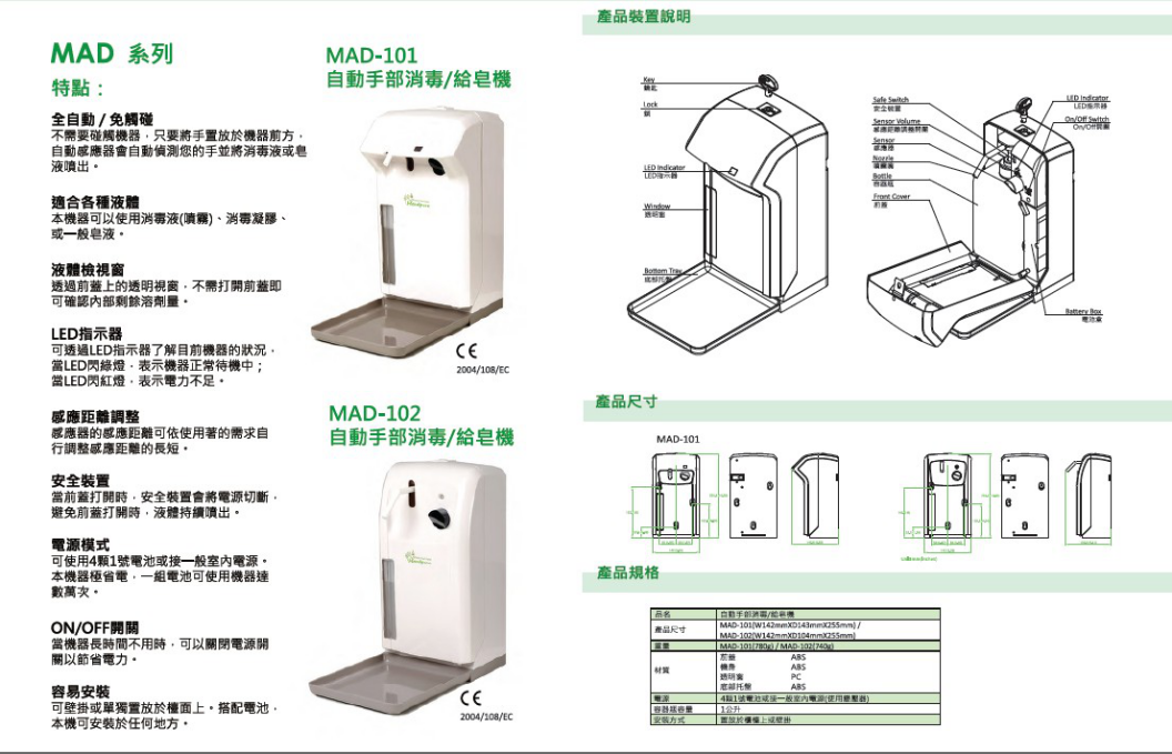 臺灣Handpure MAD-101手部自動消毒器(桌放或壁掛式)適用于家庭護理、食品廠、飲料制藥企業生產人員手部消毒;公共場所預防傳染病人手消毒;免洗速干手消毒劑; 亦可適合應用于近期甲型H1N1流感手消毒;流感手消毒液;手足口病消毒液。