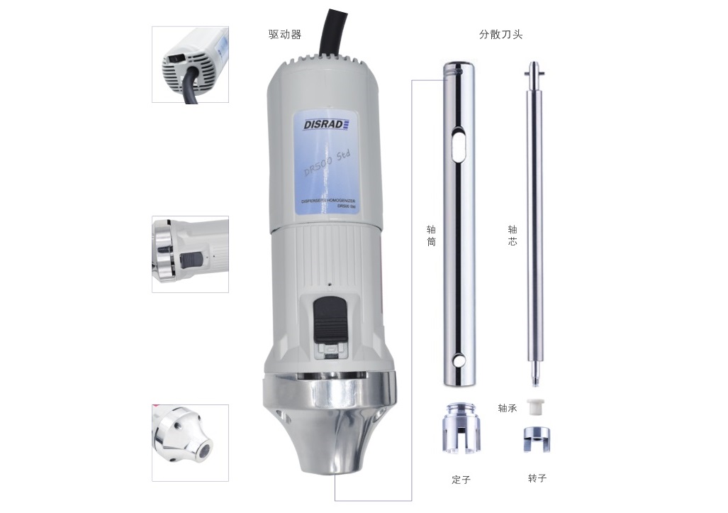 DR500 Std 主機驅(qū)動器,處理量:0.5~40000ml,轉(zhuǎn)速:10000~30000rpm(6速可調(diào)),刀頭形狀:“爪”或“鋸齒”型,可適配刀頭直徑:φ5,φ10,φ14,φ20,φ30,φ40mm